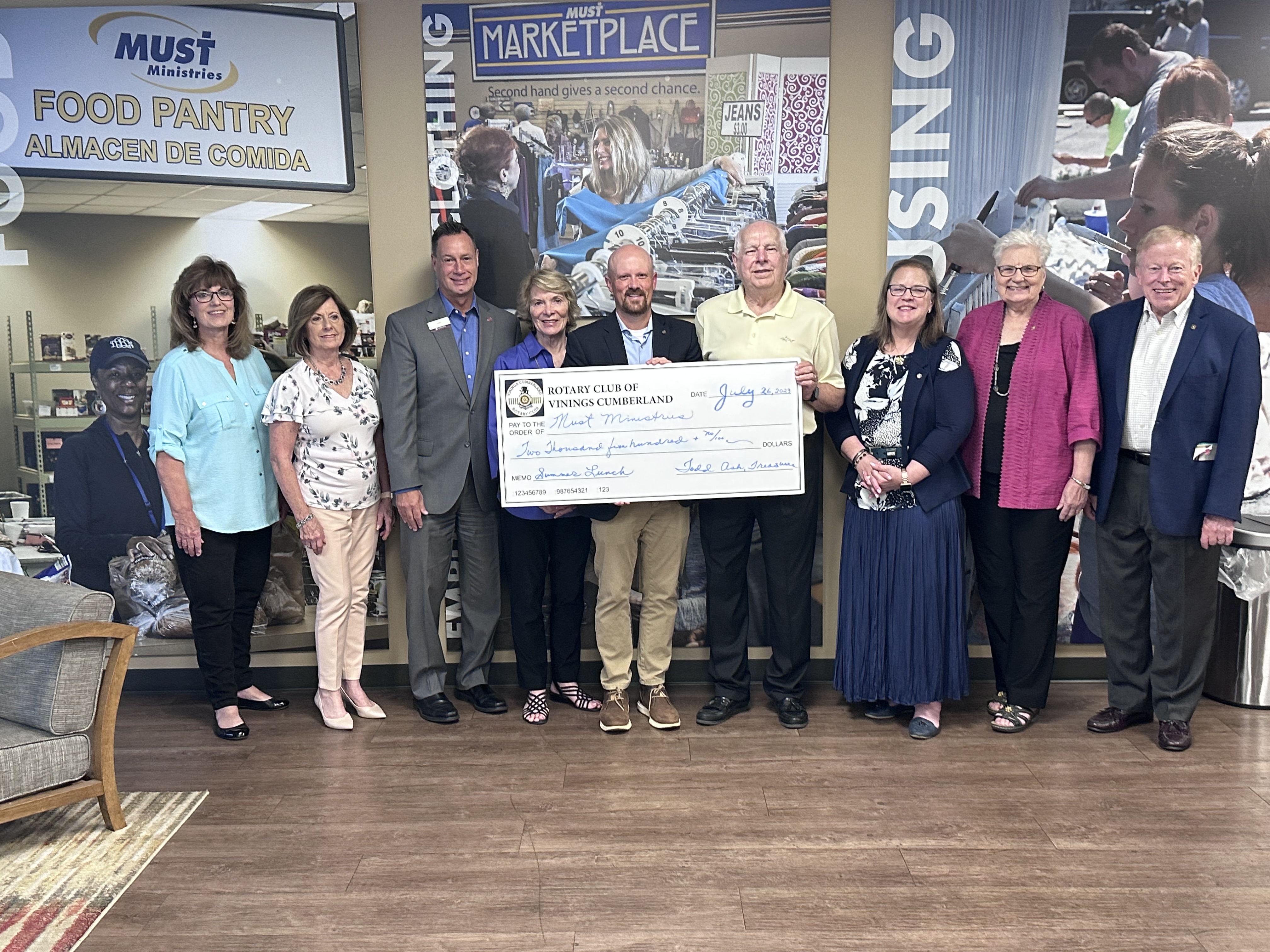 Our club donated $1000 last May, as well as an SUV filled with canned and other non perishable foods. This donation of $2500 continued our support of this program on an ongoing basis. Ten Rotary Club members presented this check in a meeting at the MUST facility in Cobb County.