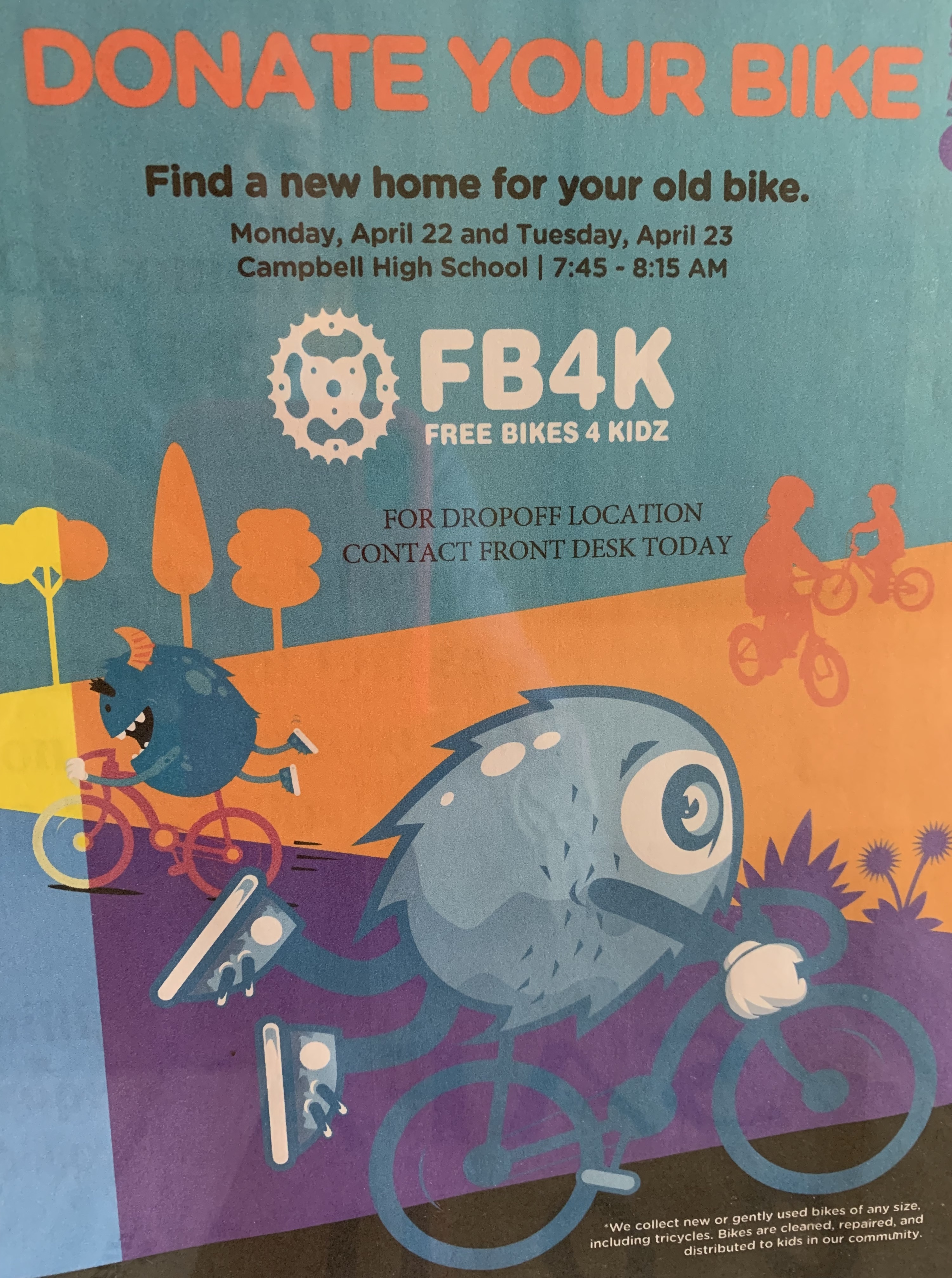 In conjunction with the Campbell High SchoolInteract Club, our club assisted in a Service Project to provide free bicycles for kids. We helped in collecting used bikes from the Vinings community and donating them to a local organization which repairs them and makes them available to kids needing transportation or entertainment. We found 15 bikes to contribute to the cause.Bike donations were taken to the Campbell High School on Monday, April 22, Earth Day.